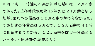 慶長3年(1598)1月10日越後国・春日山城主。上杉景勝が豊臣秀吉から120万石を与えられ、蒲生秀行にかわって会津若松城主となったが、慶長5年(1600)9月・関ケ原の合戦で、石田三成に味方したため、30万石に減され、出羽国の米沢城主となった。福島はそのまま上杉領に残され、寛文4年(1664)まで続くが、米沢藩は減封になったのにもかかわらず、家臣を減らさなかったことや、天候不順による不作等も多く、財政は年々困窮し、開墾を奨励したことは前回でもお伝えしました。